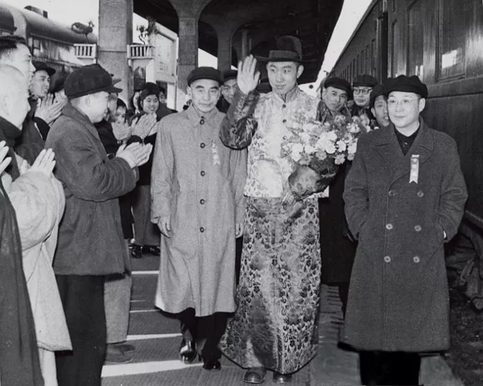 1955年3月,潘汉年(右一)等陪同全国政协副主席班禅额尔德尼·确吉坚赞步出车站